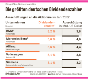 Die Dax-Konzerne, das sind die 40 größten Konzerne in Deutschland, werden nach Schätzungen des Handelsblatt in diesem Jahr rund 55 Milliarden Euro an ihre Aktionäre überweisen. Das wären vier Milliarden Euro mehr als im Jahr davor – damit würden die Dividenden in Deutschland deutlich stärker steigen als der weltweite Durchschnitt! Dazu muss man die Sonderzahlung von 9,5 Milliarden diesen Januar an die Aktionäre von Porsche noch addieren, die vom Börsengang profitierten. So viel hat noch nie ein Dax-Konzern ausgeschüttet. Nice!