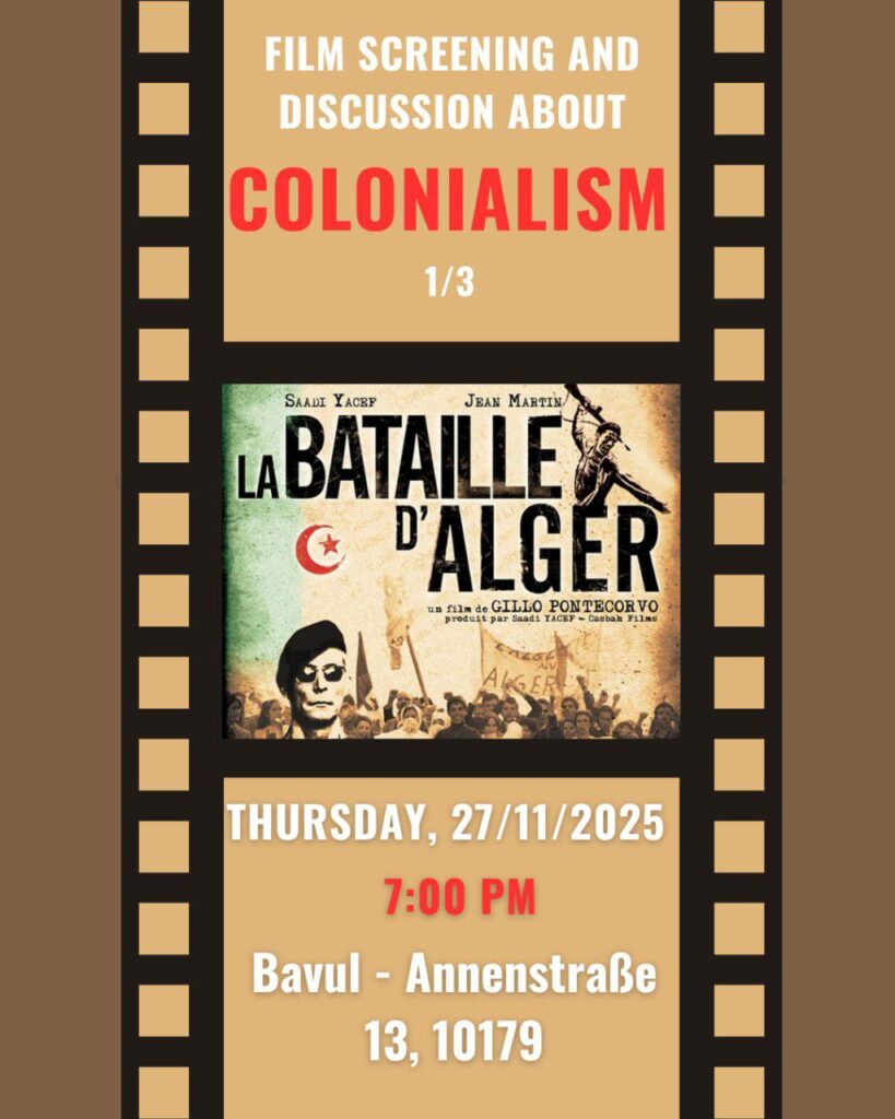 The Italien-Algerian film „The Battle of Algiers“ is the first film in our trilogy about colonialism. It shows the brutal fight between the guerrilla fighters of the FLN (National Liberation Front) fighting the French colonisation in Algiers (capital city of Algeria) and the French paratroopers attempting to keep control on the city. The film concentrates on the revolutionary fighter Ali La Pointe (Ali Ammar) during the years between 1954 and 1957.