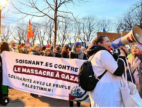 „Pflegekräfte gegen das Massaker in Gaza!“, so steht es auf dem Transparent, mit dem das Kollektiv „Pflegekräfte für Gaza“ bei den Demonstrationen, die jeden Samstag aus Solidarität mit der palästinensischen |