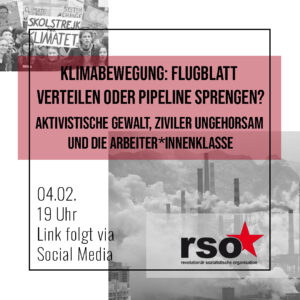 Klimabewegung: Flugblatt verteilen oder Pipeline sprengen? – aktivistische Gewalt, ziviler Ungehorsam und die Arbeiter*innenklasse Wenn auch durch die #corona​ Pandemie der CO²-Ausstoß 2020 um 7% verringert wurde, so ist kein Ende der #klimazerstörung​ zu erkennen. 2019, im Jahr der weltweiten großen #klimaproteste​ von #fridaysforfuture​, hatte erneut einen Rekordausstoß an Klimagasen gesehen, in immer entlegeneren Gegenden der Erde wird Plastikmüll entdeckt und das Extremwetter nimmt zu. Vor diesem Hintergrund und den sehr „braven“ Proteste von Fridays for Future fragen sich Teile der Klimabewegung, ob nicht radikalere Maßnahmen notwendig wären, um die Klimakiller der Öl-, Gas- und Energiekonzerne aber auch der Autoindustrie zu stoppen. Der schwedische Aktivist Andreas Malm fragt provokativ, wie man „eine Pipeline sprengt“, „Ende Gelände“ versucht mit Bagger- und Bahnbesetzungen die Kohleverbrennung in der Lausitz und im Rheinland zu unterbrechen, extinction rebellion versucht eine Alternativ zu den Apellen von FFF und Greta Thunberg. Aber ist Gewalt angesicht der drohenden Klimakatastrophe „in der Demokratie“ berechtigt? Und wenn ja welche Gewalt und unter welchen Umständen? Wir wollen uns in einem Referat damit auseinandersetzen, was der „demokratische“ bürgerliche Staat ist und gemeinsam mit einem Aktivisten der Interventionistischen Linken in ein Gespräch über revolutionäre Antworten und aktivistische Praktiken für die Klimabewegung kommen.