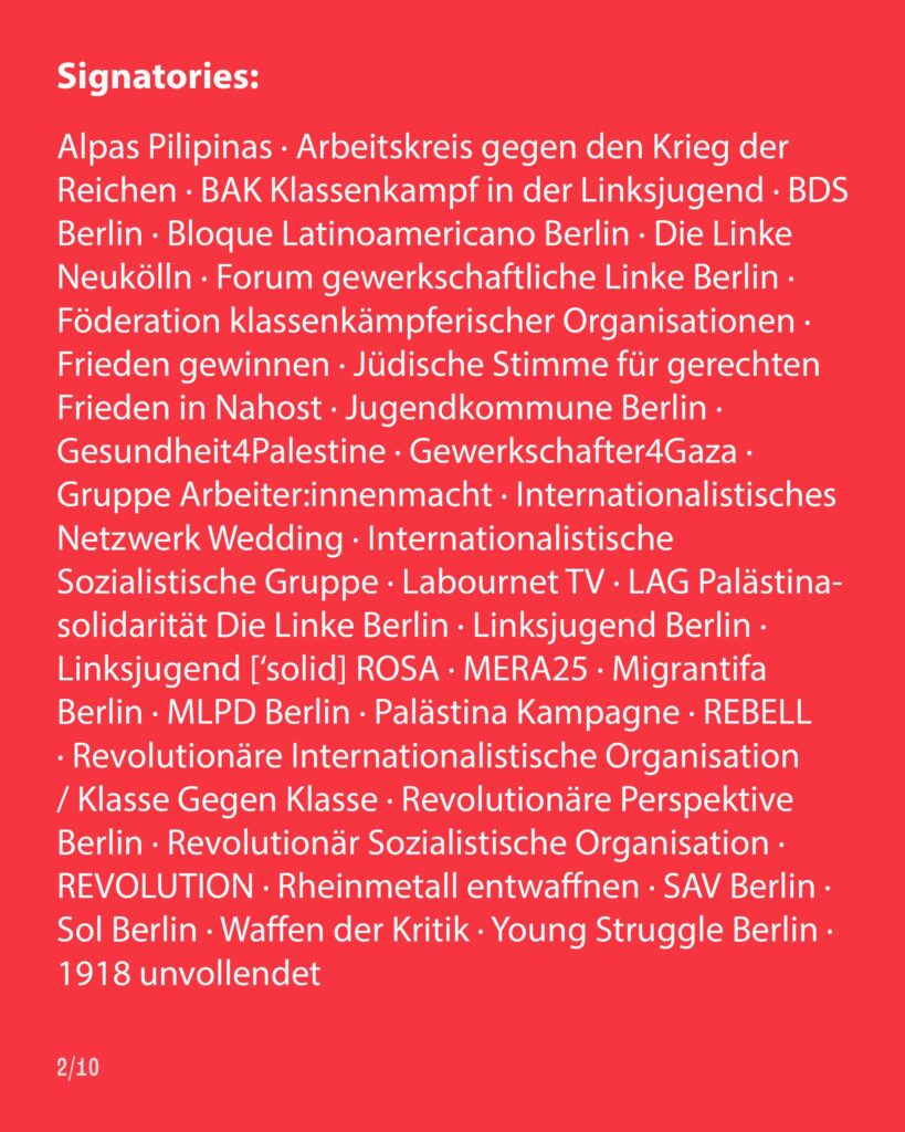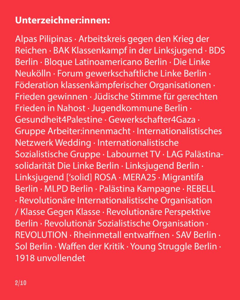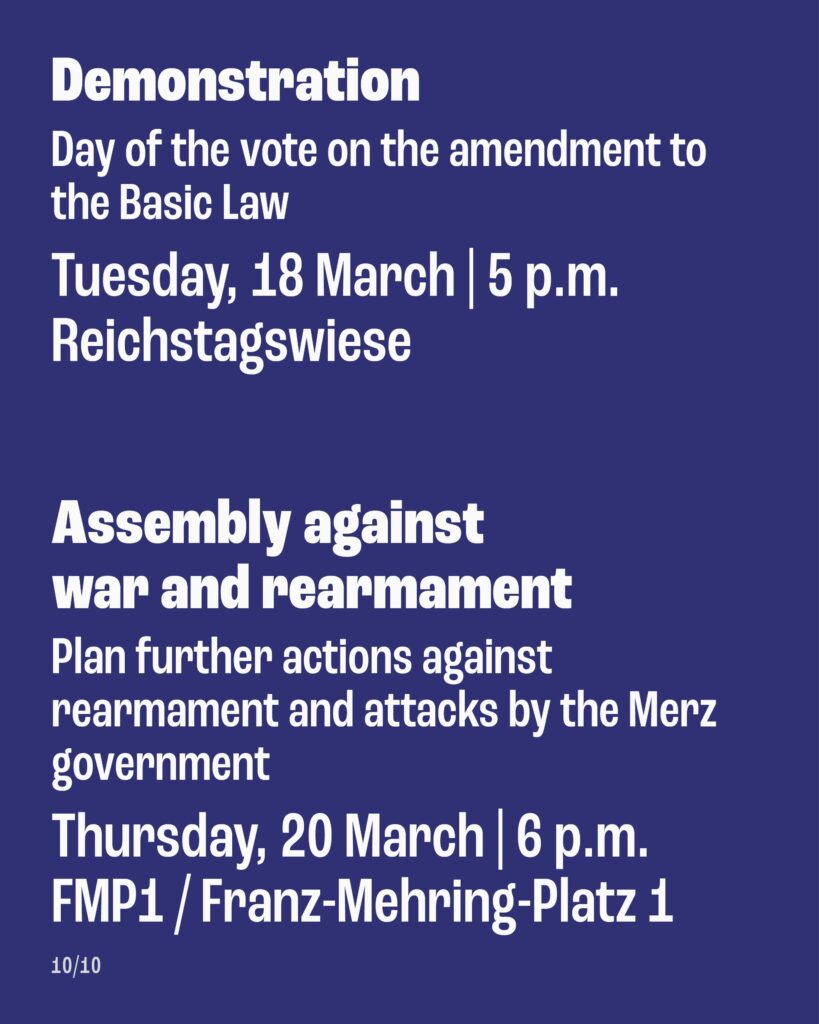 In order to provide a point of contact for all those who now want to organize and plan further actions against the armament plans and against the attacks of the coming Merz government, we also invite you to an assembly on Thuersday, March 20, 6 pm, FMP1 Franz-Mehring-Platz 1.