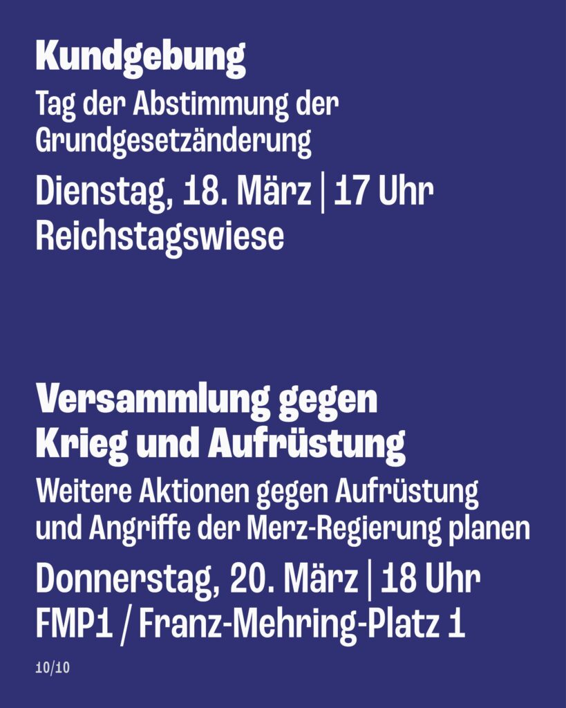 Um für all jene, die sich jetzt organisieren wollen, eine Anlaufstelle zu bieten und weitere Aktionen gegen die Aufrüstungspläne und gegen die Angriffe der kommenden Merz-Regierung zu planen, laden wir außerdem am Donnerstag, den 20. März, ab 18 Uhr im FMP1 Franz-Mehring-Platz 1 zu einer großen Versammlung gegen Krieg und Aufrüstung ein.