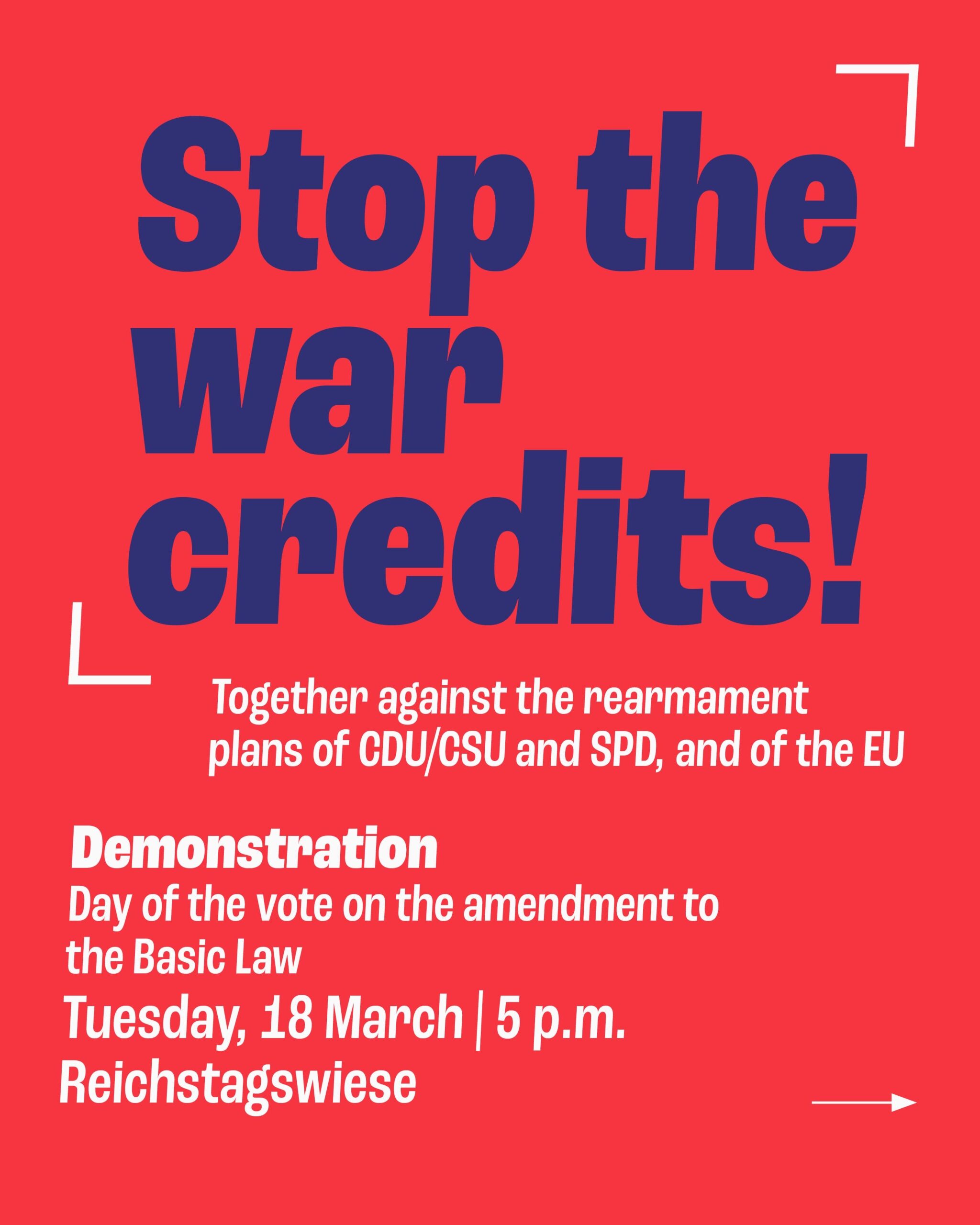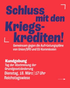 Deshalb wollen wir am Tag der geplanten Abstimmung der Grundgesetzänderung – Dienstag, den 18. März – ab 17 Uhr vor dem Bundestag (Reichstagswiese/Platz der Republik) demonstrieren.