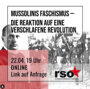 Oft wird der Aufstieg des Italienischen Faschismus mit Mussolinis „Marsch auf Rom“ als Staatsstreich erzählt. Doch dessen Machtübernahme ist viel mehr ein langer Prozess. Eine Gratwanderung zwischen der Legalität, welche sich in Teilnahme an den Wahlen und Zusammenarbeit mit der Regierung auf verschiedensten Ebenen zeigt, und der Illegalität, welche Ausdruck in der maßlosen Gewalt der faschistischen Milizen und brennenden Gewerkschafts-Kammern findet. Direkt nach dem Weltkrieg ist Italien ein revolutionäres Pulverfass, Fabrikbesetzungen – Generalstreiks und Landbesetzungen sind Ausdruck des Drangs der Arbeiter:innen nach einem anderen System. Die gesamte Bevölkerung ist politisiert, und im Angesicht der Sozialistischen Bewegungen gärt der Faschismus, geleitet von Mussolinis Sinn für Macht. Wie konnten die Faschist:innen gegen die Interessen der Massen siegen? Was war die Politik der Arbeiter:innenbewegung? Hätte man den Faschismus verhindern können?